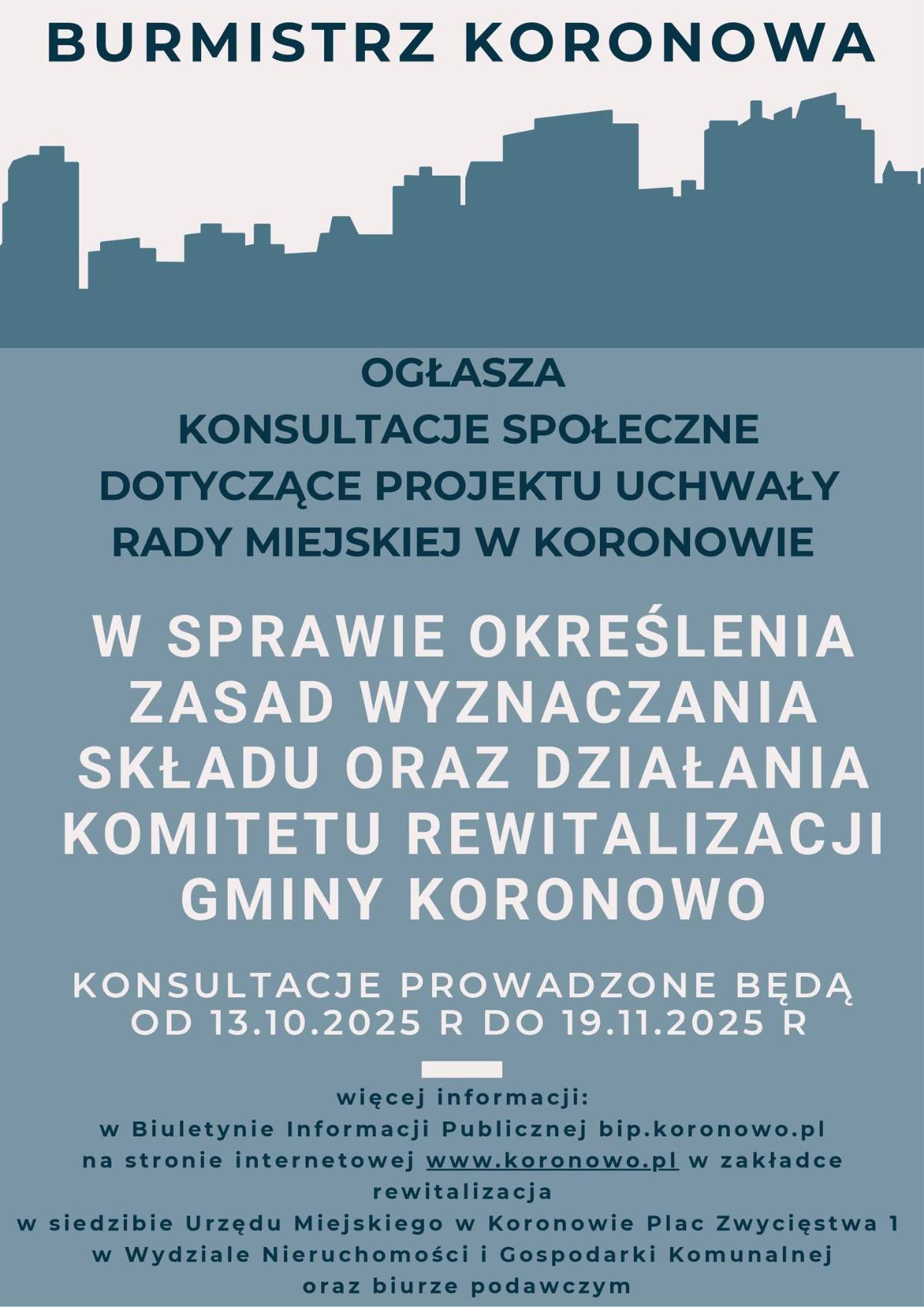 Spotkanie otwarte ze wszystkimi zainteresowanymi procesem rewitalizacji, na którym możliwe będzie omówienie propozycji zasad wyznaczania składu oraz zasad działania Komitetu Rewitalizacji na terenie Gminy Koronowo, wyrażenie opinii i uwag dotyczących projektu uchwały odbędzie się 04.11.2025 r w Sali sesyjnej Urzędu Miejskiego w Koronowie o godz. 17:00.