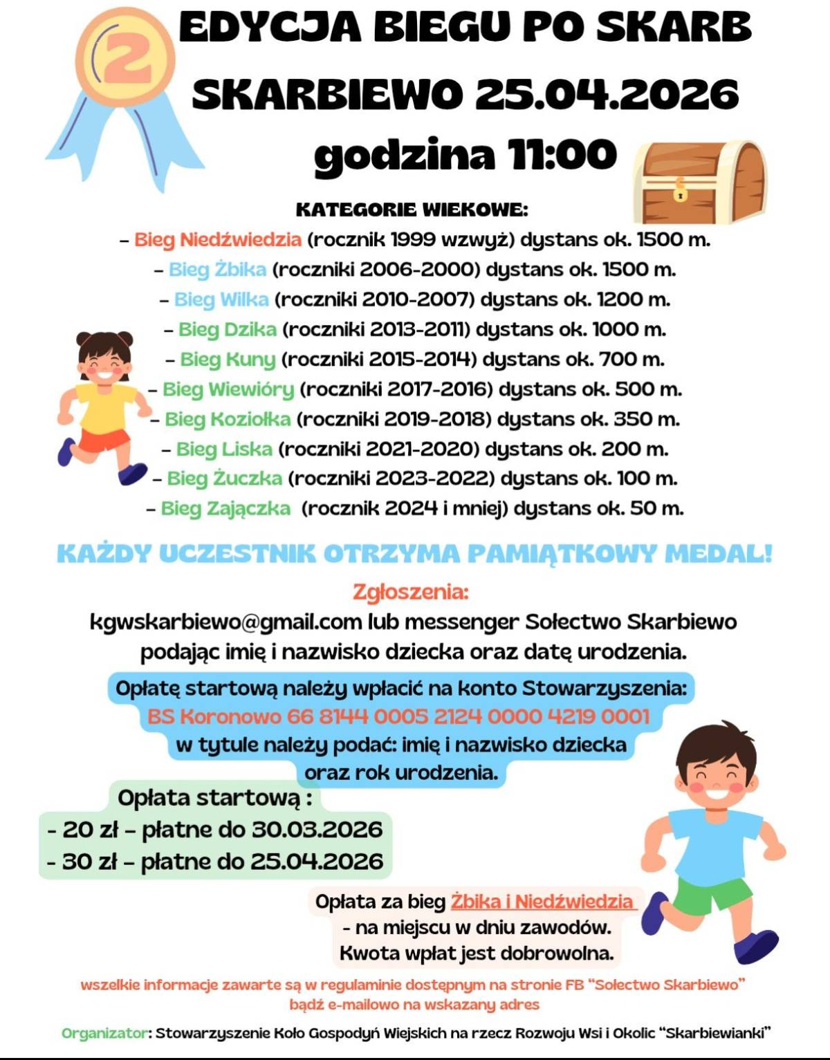 Szczegóły, w tym regulamin Biegu po Skarb znajdują się na profilu Sołectwa Skarbiewo pod linkiem https://www.facebook.com/permalink.php?story_fbid=pfbid035oRu7Q4QErNAkuhgY1KRdNfqa7FunJp3DbfkvzeW38gAEEwPDEso37VC3Ztsh3Awl&id=61568888064534