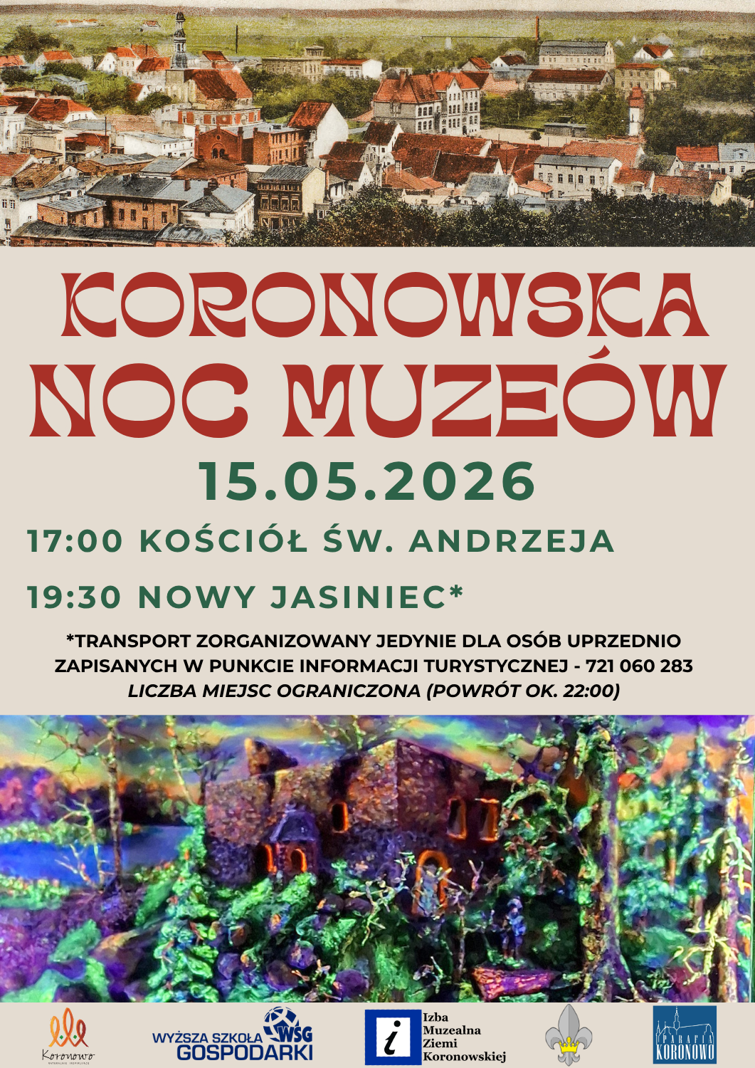 Zapraszamy serdecznie na Koronowską Noc Muzeów, która odbędzie się tradycyjnie na wieczór przed Europejską Nocą Muzeów tj. 15.05.2026 r.