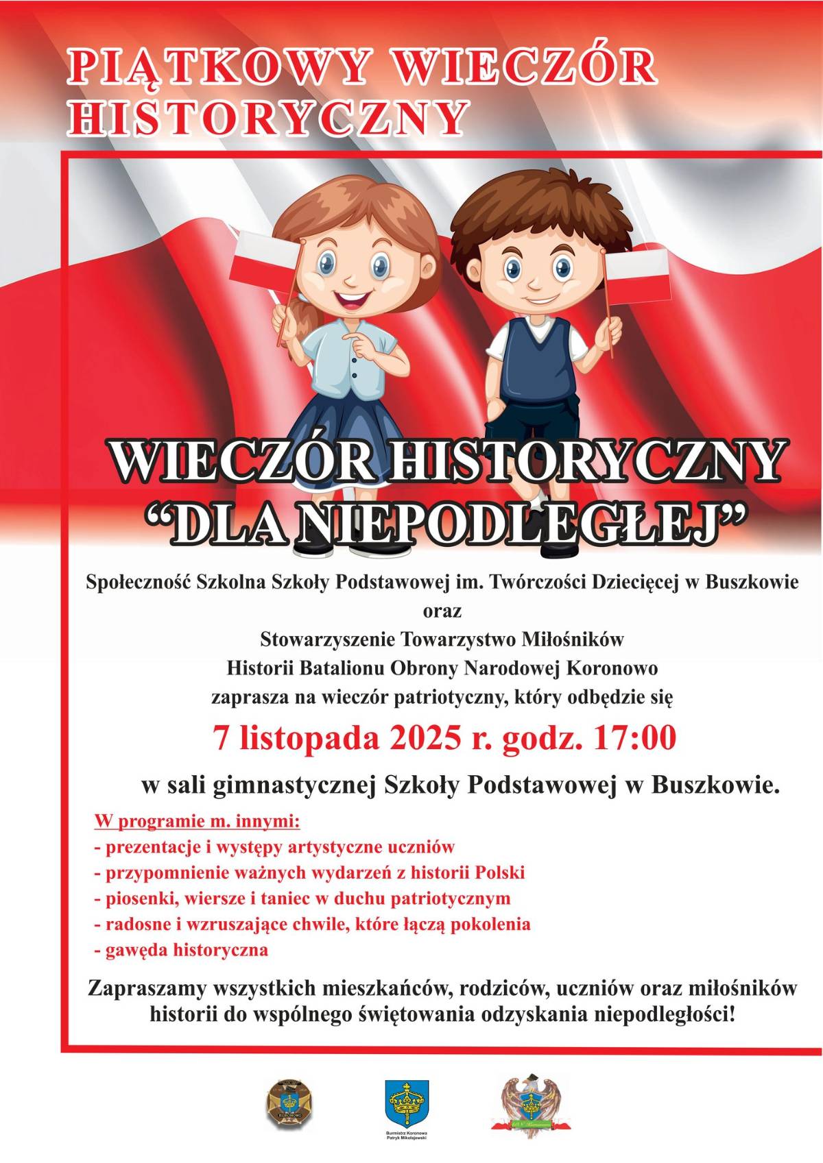 Społeczność Szkolna Szkoły Podstawowej im. Twórczości Dziecięcej w Buszkowie oraz Stowarzyszenie Towarzystwo Miłośników Historii Batalionu Obrony Narodowej Koronowo zapraszają na wieczór patriotyczny, który odbędzie się 7 listopada 2025 r. o godz. 17:00 w sali gimnastycznej szkoły.